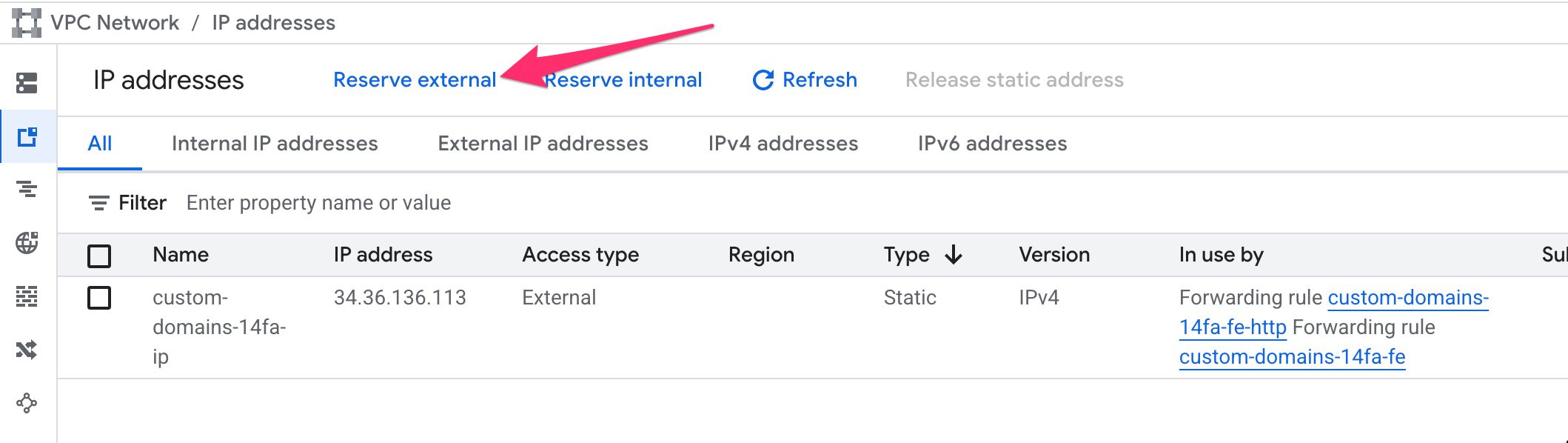 Click Reserve. Google will allocate a /96 IPv6 prefix and surface the first usable address. You’ll see it listed in the IP addresses table. It will look something like 2600:1901:0:xxxx::.