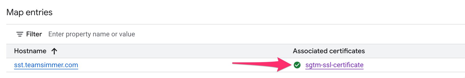 entry-namewith a custom name for the certificate entry. Replacemap-namewith the name of the map you just created. Replace<sgtm-hostname>with the hostname the certificate should cover. Replacecertificate-namewith the name of the SSL certificate you created in the beginning of this step.