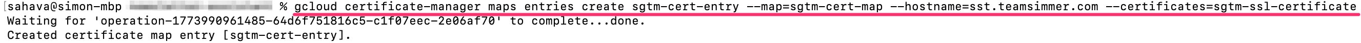 Next, you need to create a certificate map entry that links your new certificate and its associated hostnames to the certificate map. Here’s the command: