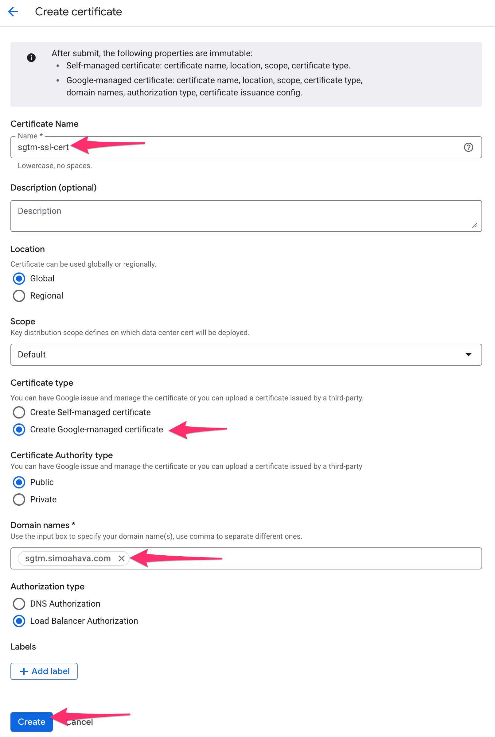 Here, give the certificate name (e.g. sgtm-ssl-cert), choose Create Google-managed certificate as the type, add the domain name(s) you want the certificate to cover, and leave everything else as default and click Create.