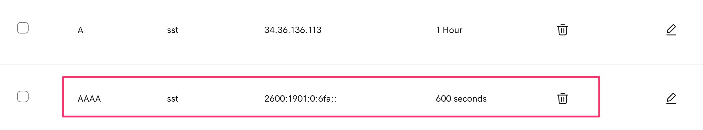 sst(or whatever subdomain you’re using) - Value: the IPv6 address you reserved in Step 1