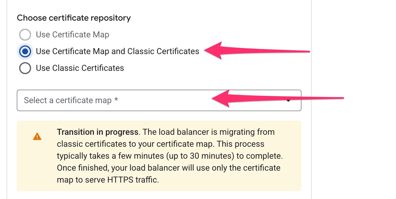 Google Cloud has migrated to certificate maps in Load Balancer frontend configurations. While you can still link a single frontend directly to a certificate, as soon as you want to add multiple frontends, you need to use a certificate map. It’s also possible that at some point in the near future, you’ll need a certificate map for your single SSL frontend, too.
